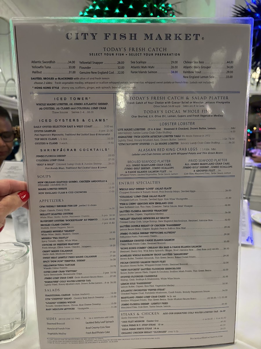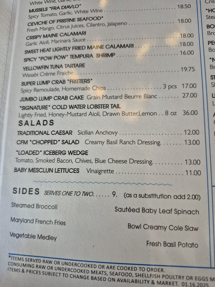 For heartier fare, choose from premium meats like the delectable 1855 Filet Mignon or cut of the USDA Prime N.Y. Strip Steak. The menu also features delicious sides like Sautéed Baby Leaf Spinach and Maryland French Fries that complement each main flawlessly.